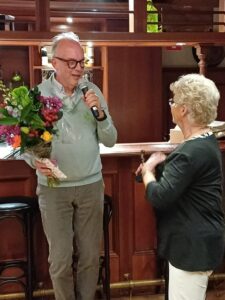 Namens de BridgeBond overhandigde Ria de welverdiende “Kei” aan Rina. De voorzitter van Bridgeclub Wognum, Philip Vos, gaf de zichtbaar blije en trotse Rina ook nog een prachtige bos bloemen.
